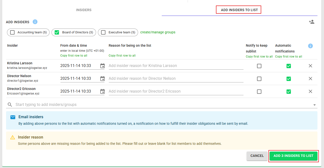 2. You may also add pre-defined groups of insiders in one go. You can create insiders groups which allows you to add multiple insiders through pre-defined groups, i.e. board and management. You can also add persons and create groups without any communication being sent through the system. Please click