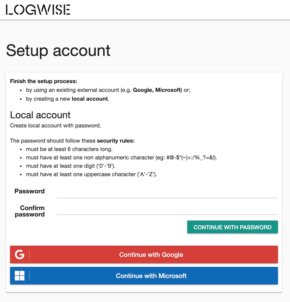Click on the green button "Continue with password" to activate your account. Note: you will not be able to activate SMS two factor authentication with Google or Microsoft accounts.