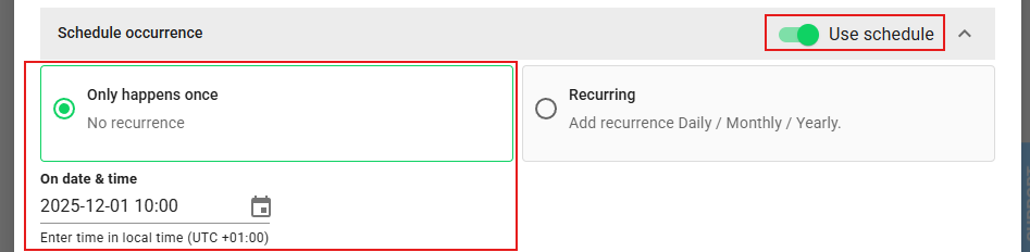 The default option is to send the notification right away but you can also schedule it for a later time or be a recurring event by opening the “Schedule occurrence” dropdown which turns on the scheduling feature. Note that if you have opened the dropdown section the toggle is automatically turned on, if you wish to not schedule the notification you need to turn off the “Use schedule” toggle.