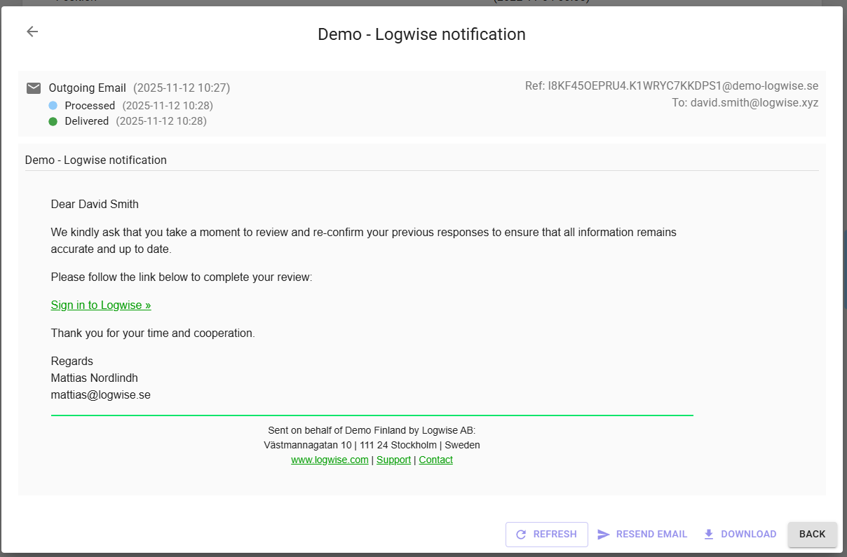 This guide explains how to initiate and manage a policy list review request within the Logwise system. It covers how to start a review process, choose whether to notify list members immediately or later, select email templates, schedule notifications, and monitor review progress and delivery.