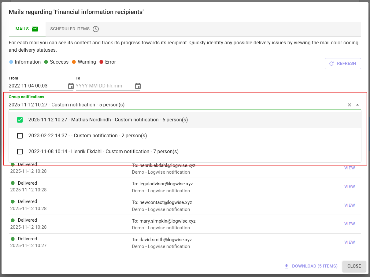 When the notification is sent to the list it will create a group notification and you can view delivery progress and email content as usual by opening the mails section (list menu > mails) and then filter the emails based on the recently sent group notification:
