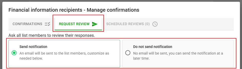 If you decide to not send a notification then there are no more options and just click the submit button and all list members will be moved to the status of “Review requested”.